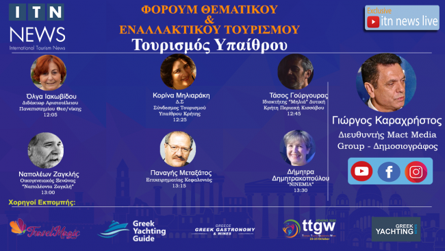 Ημερομηνία: Παρασκευή, 9 Οκτωβρίου 2020 Ώρα διεξαγωγής: 12:00 – 13:30 ΤΟΥΡΙΣΜΟΣ ΥΓΕΙΑΣ ΚΑΙ ΕΥΕΞΙΑΣ Το πάνελ θα επικεντρωθεί στις απαντήσεις των ερωτήσεων που θα απευθύνουν οι καλεσμένοι στον Διευθυντή της Mact Media Group και δημοσιογράφο κ. ΓΕΩΡΓΙΟΣ ΚΑΡΑΧΡΗΣΤΟΣ. ΟΜΙΛΗΤΕΣ ΥΠΟΣΤΗΡΙΚΤΕΣ